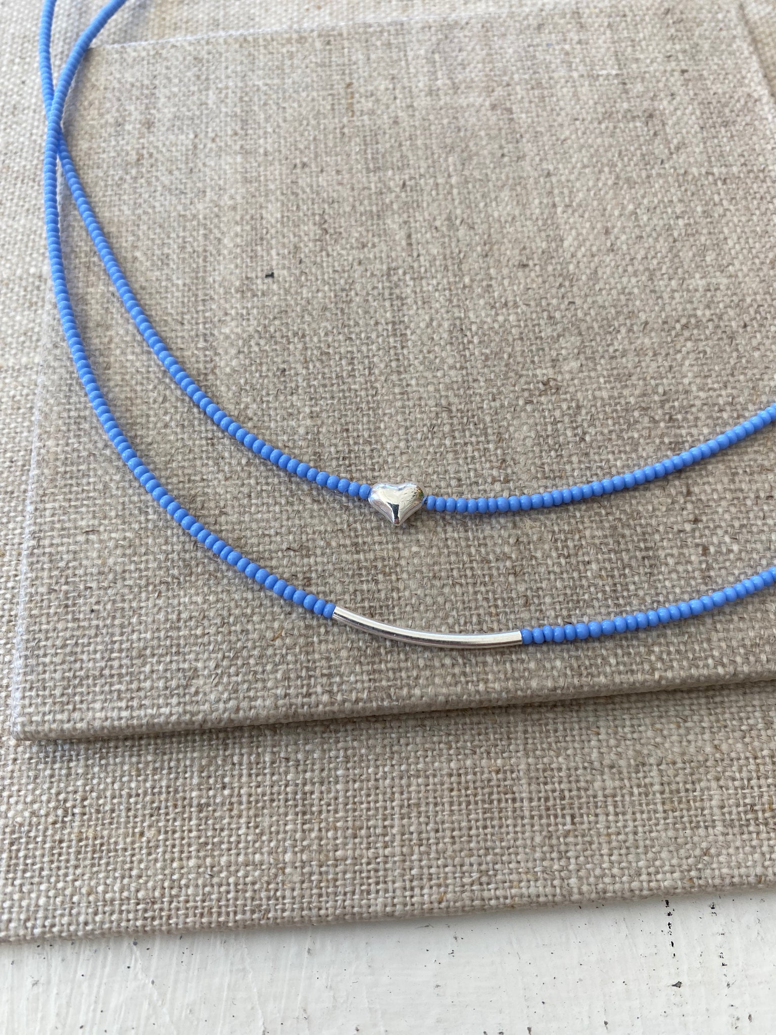 A delicate necklace of tiny glass seed beads with a sterling silver puffy heart centre. Ends in sterling silver