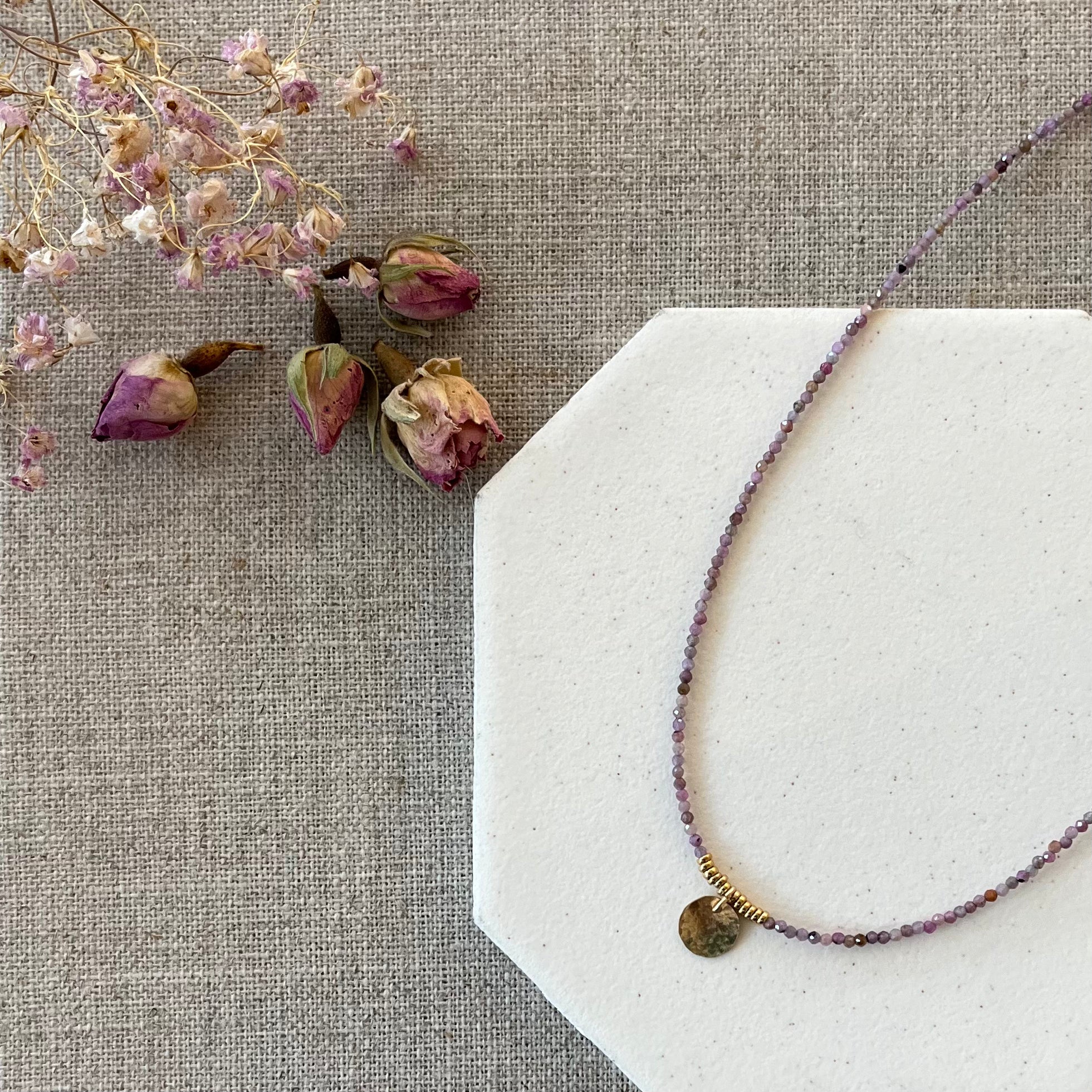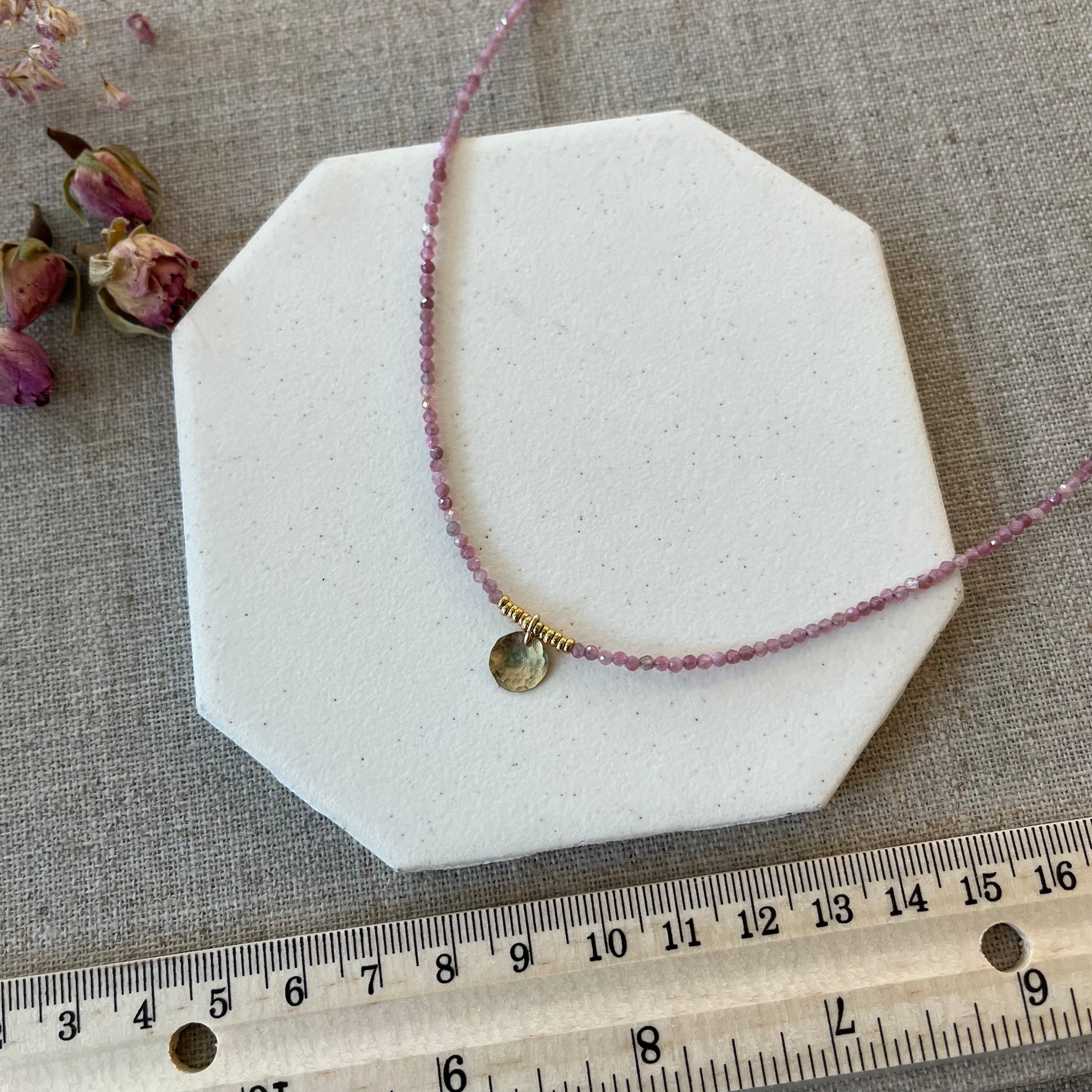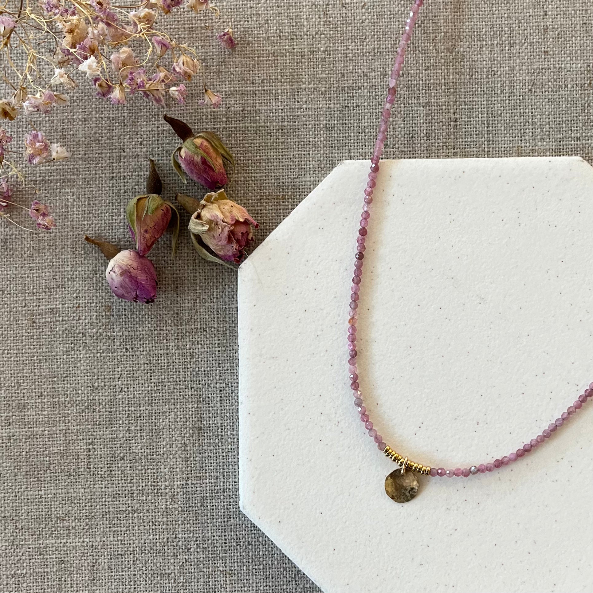 A delicate necklace of faceted pink tourmaline stones with a hand hammered 14 karat gold disk pendant.
