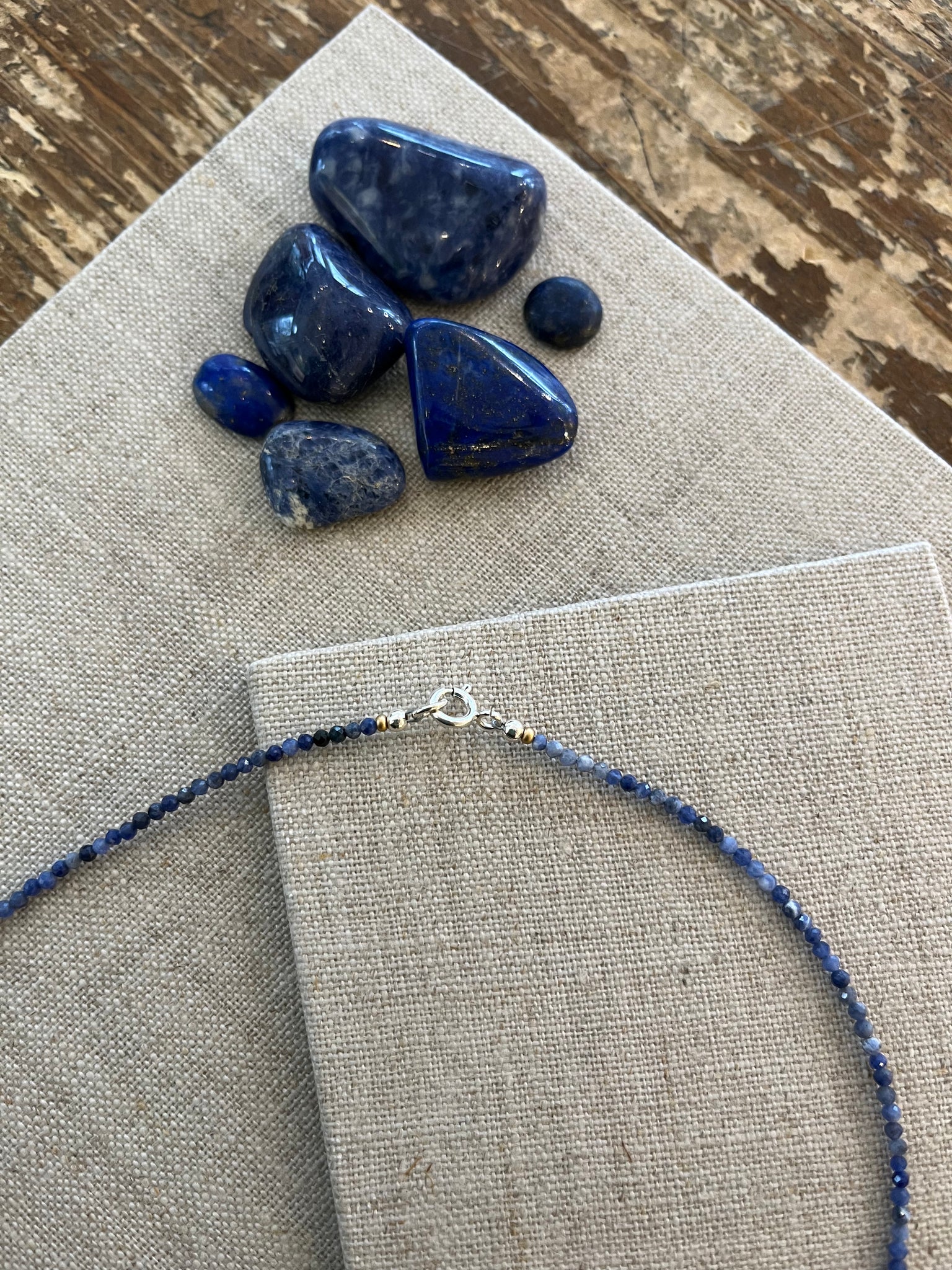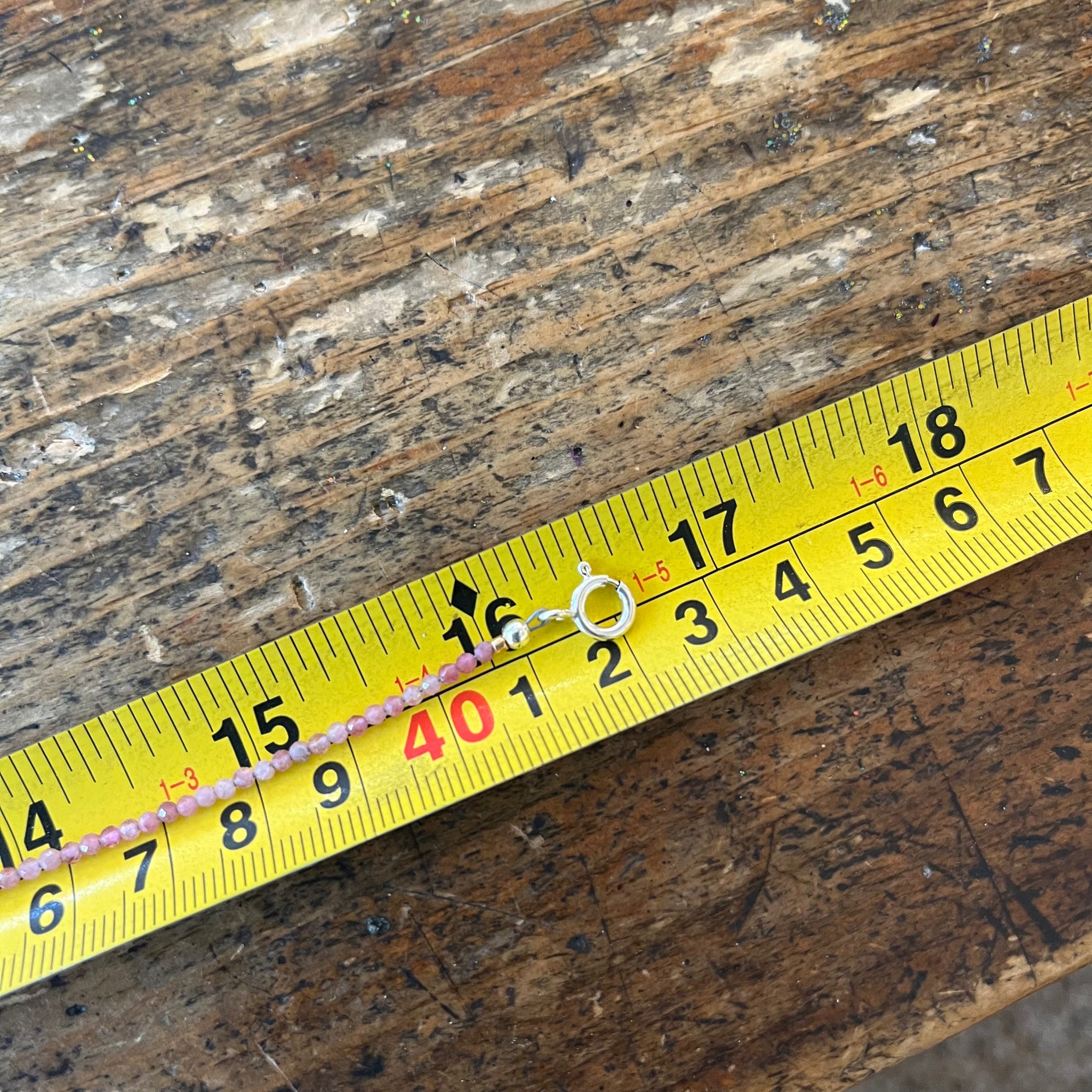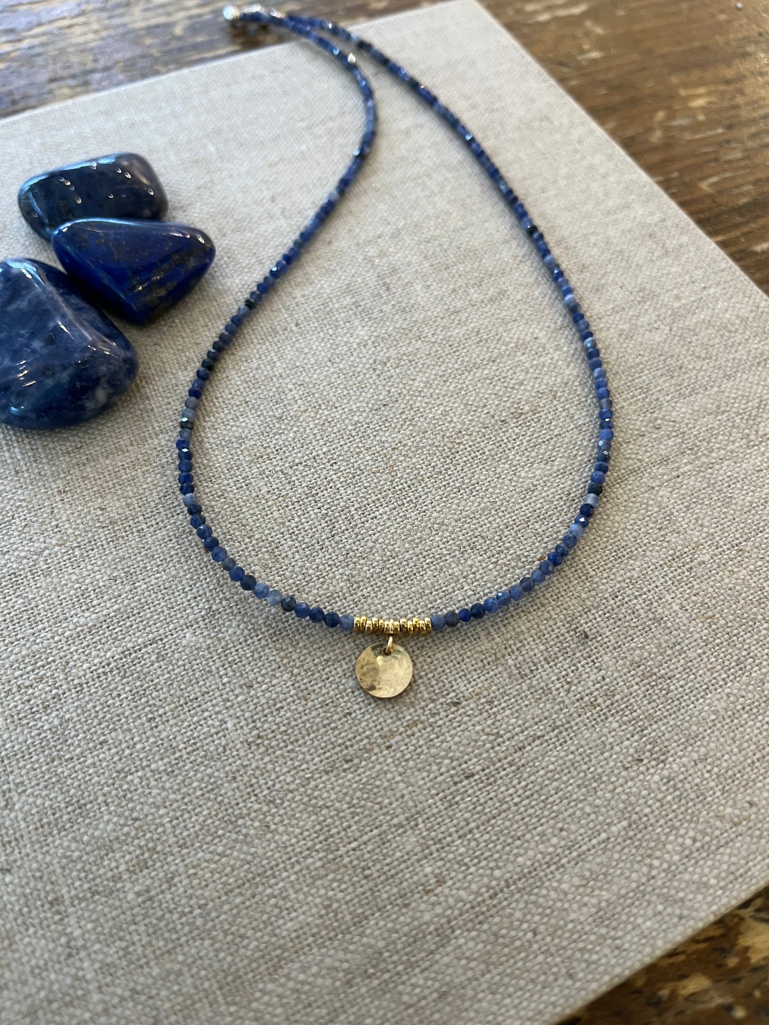 A delicate necklace of faceted pink tourmaline stones with a hand hammered 14 karat gold disk pendant.