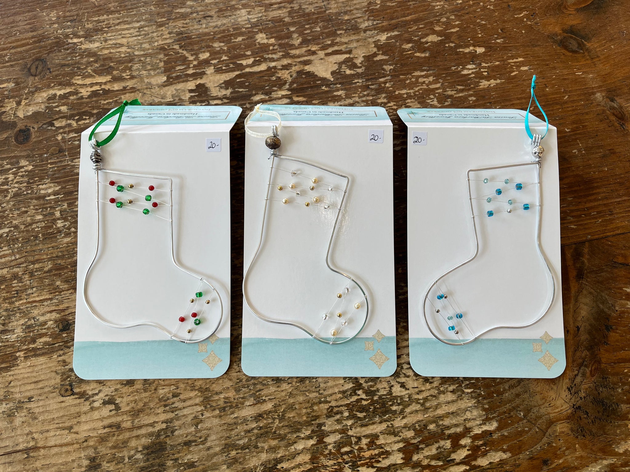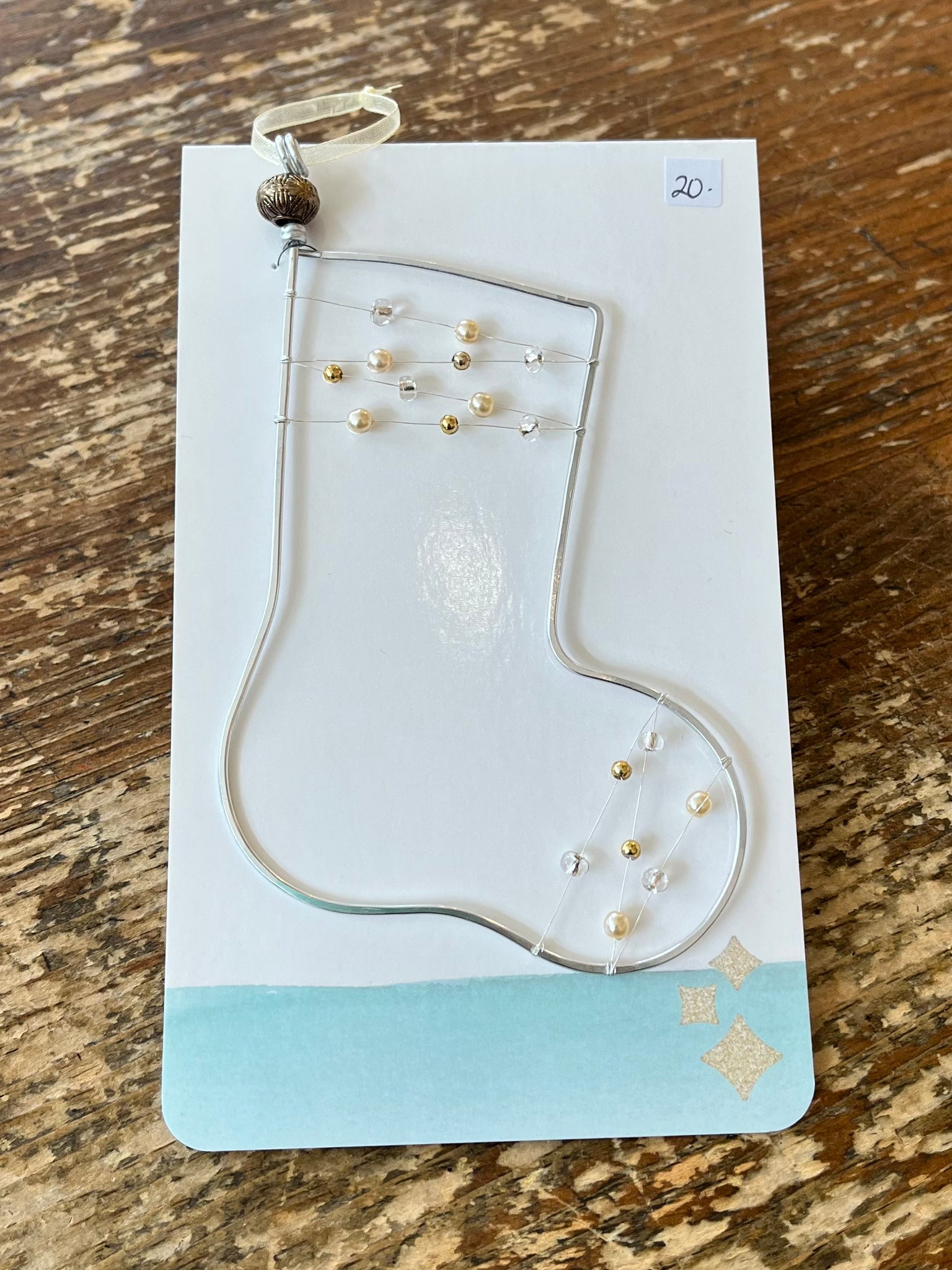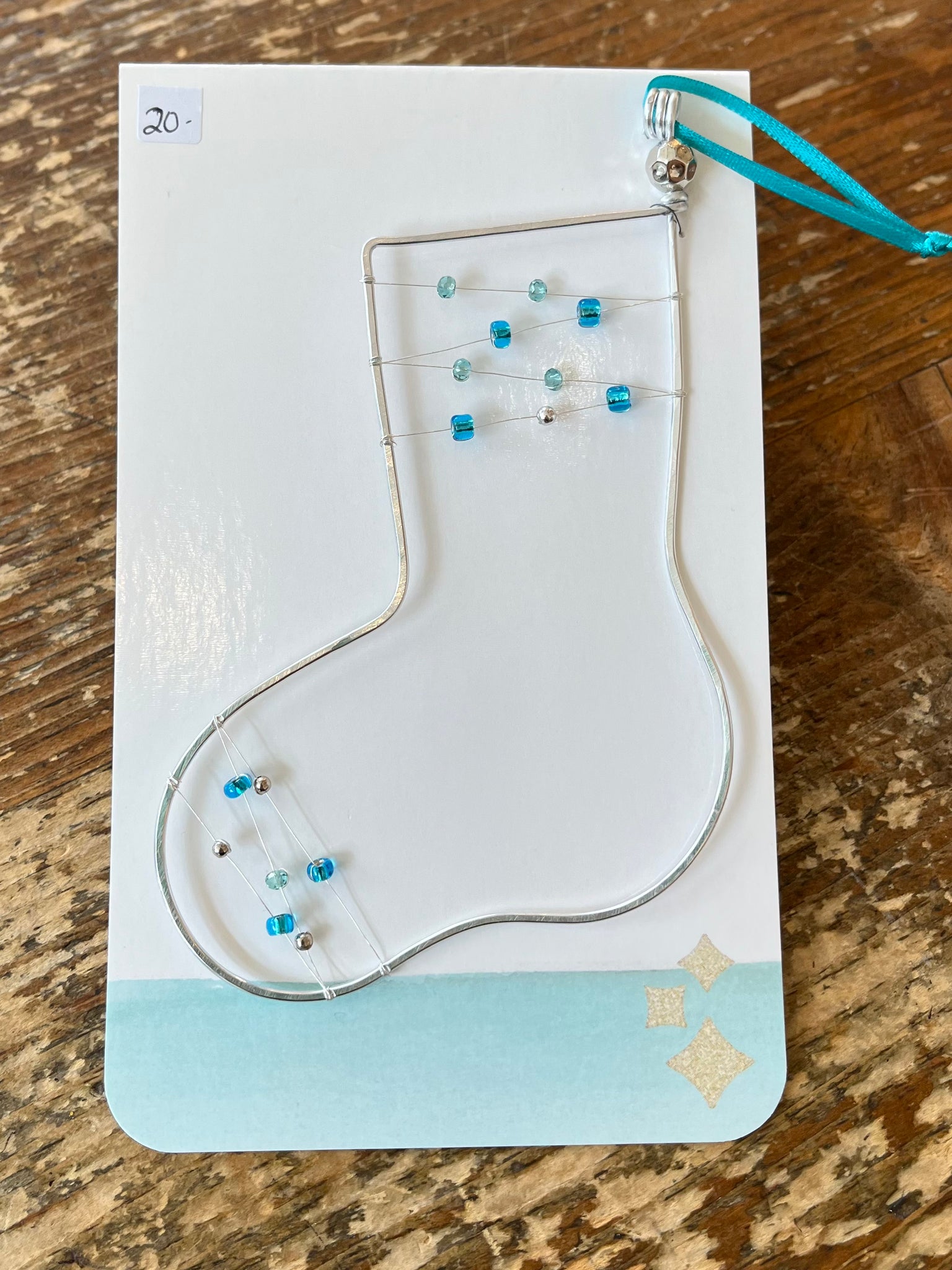 Hammered aluminum wire Christmas ornaments. These ornaments are comprised of upcycled beads and buttons.
