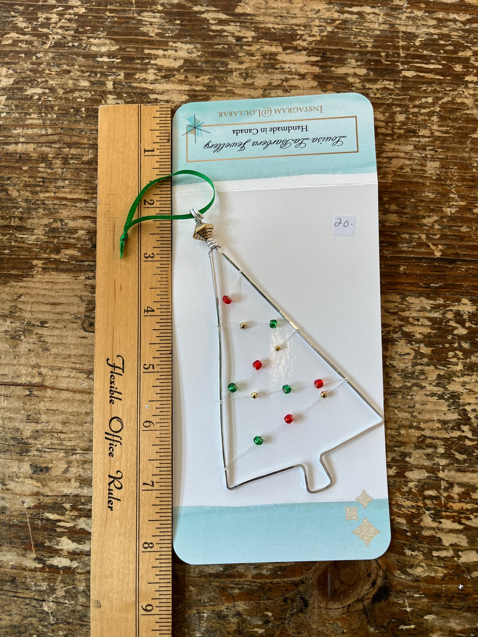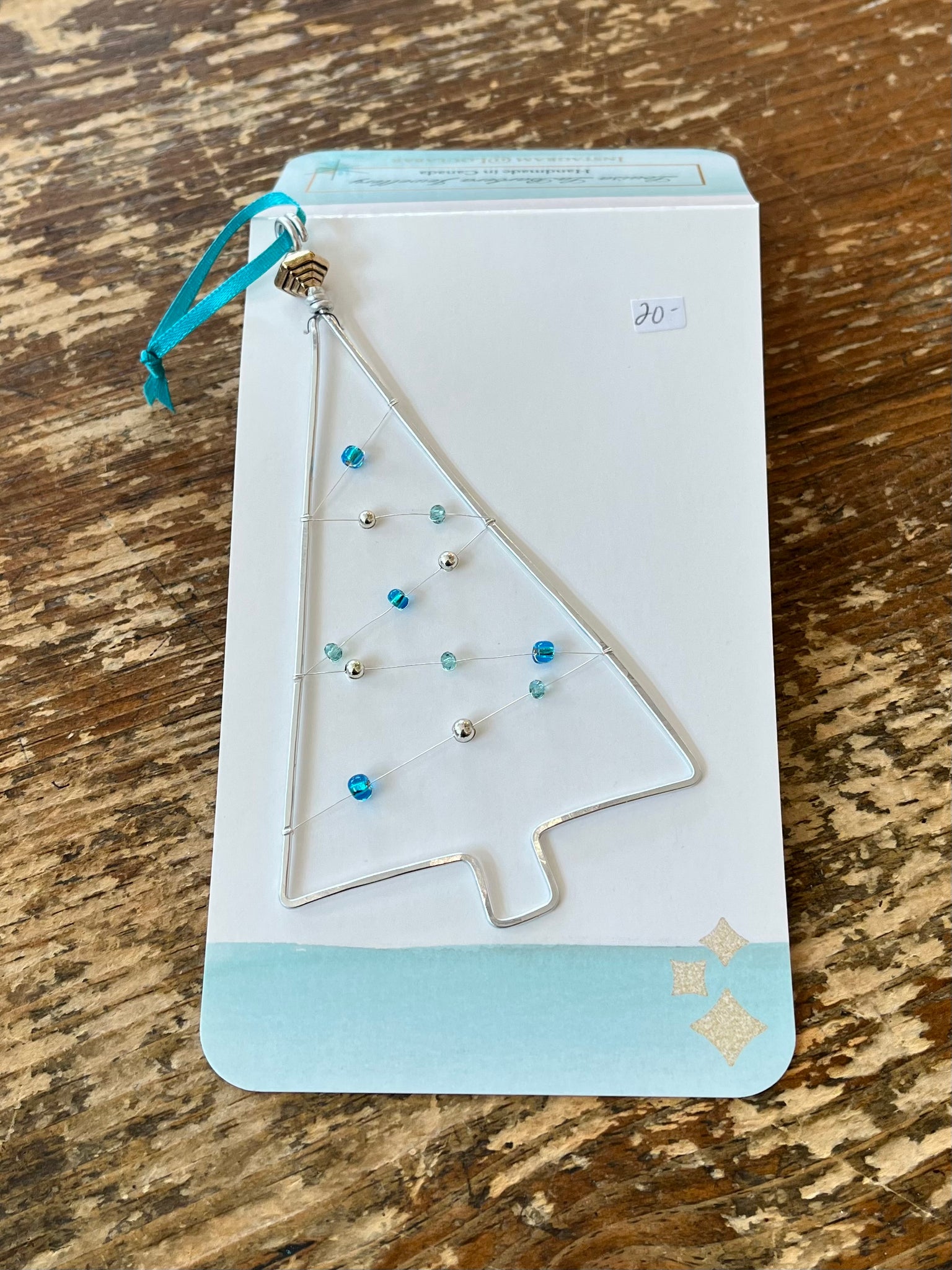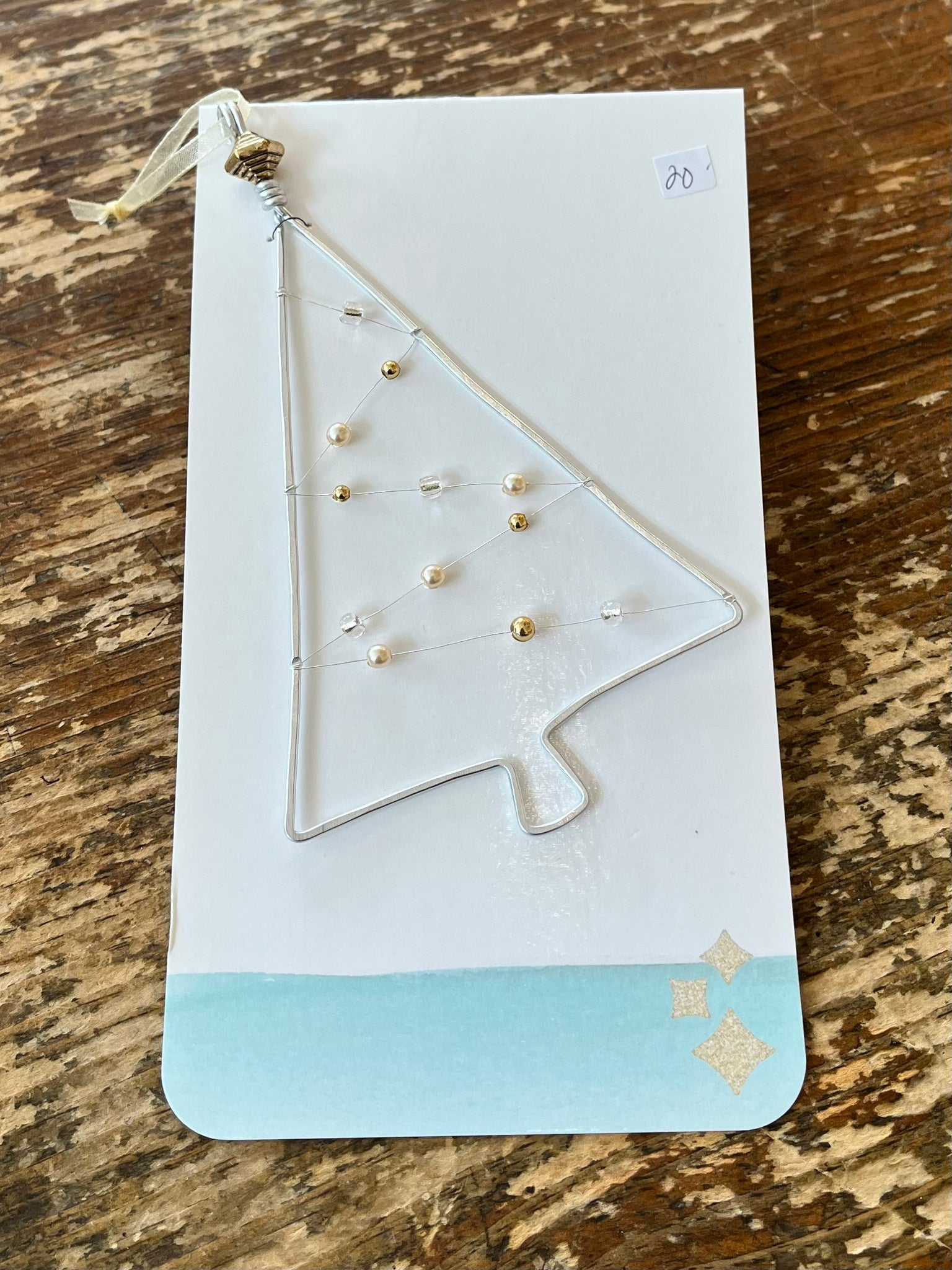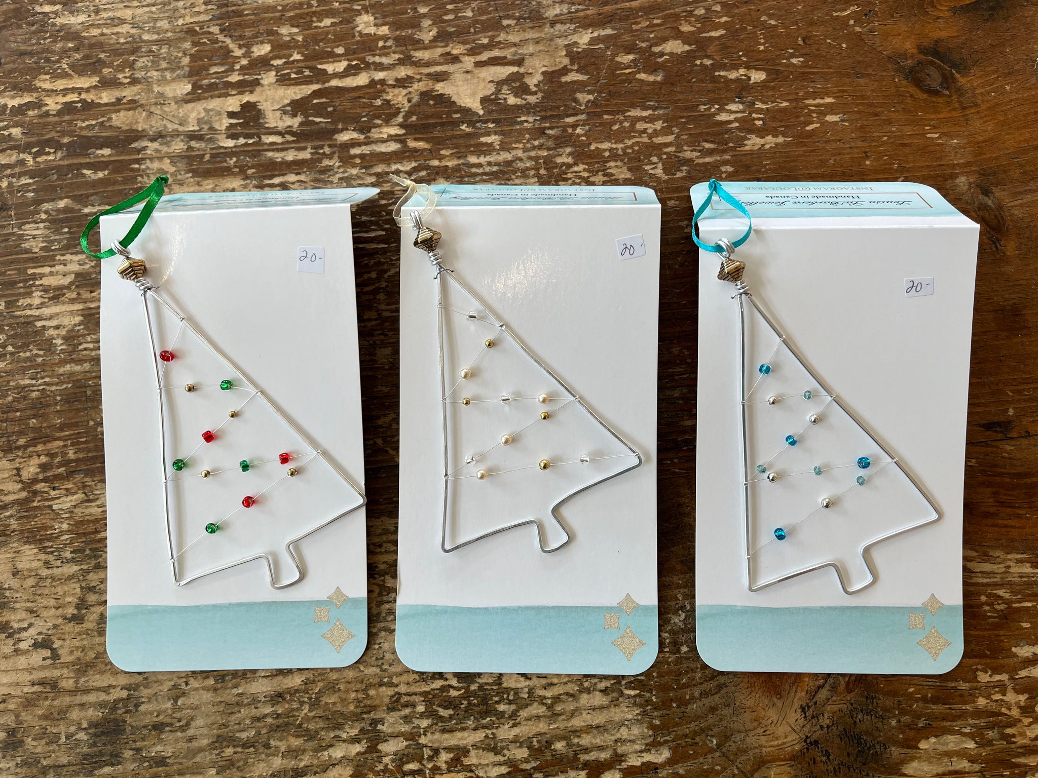 Hammered aluminum wire Christmas ornaments. These ornaments are comprised of upcycled beads and buttons.