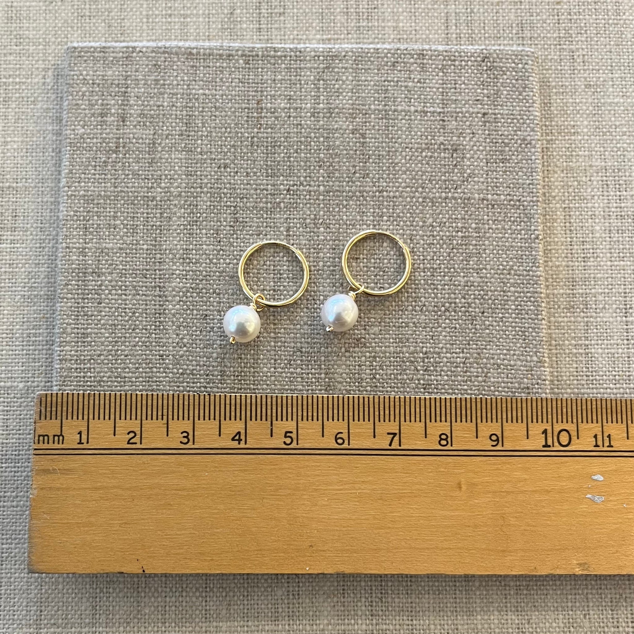 An 8 mm round freshwater pearl on 14 karat gold sleeper hoops (14mm).