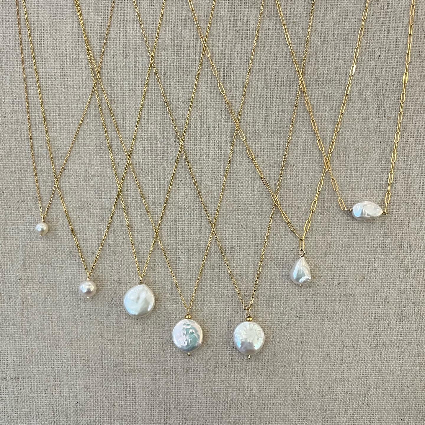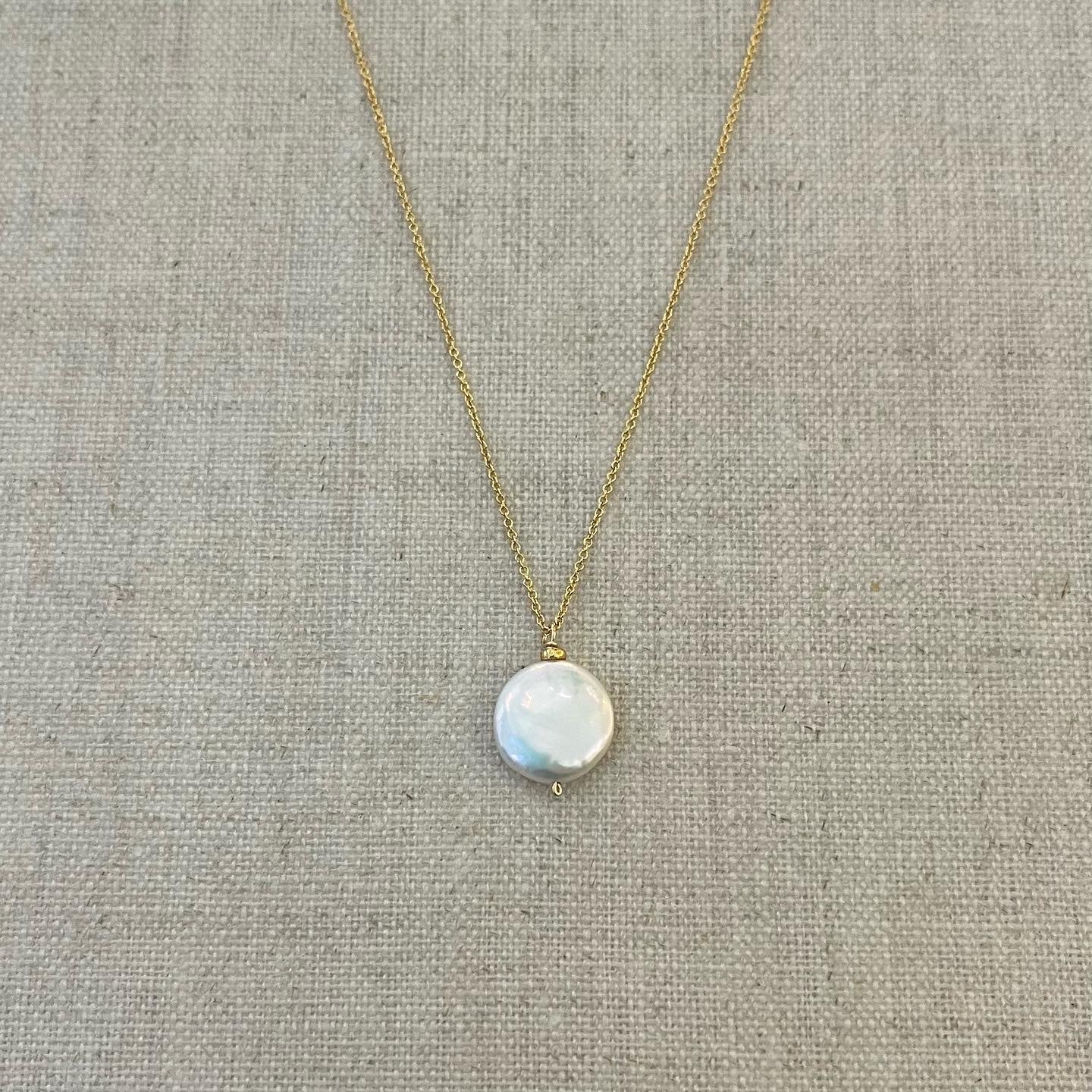 A single freshwater coin pearl on a 14 karat gold fill or sterling silver chain