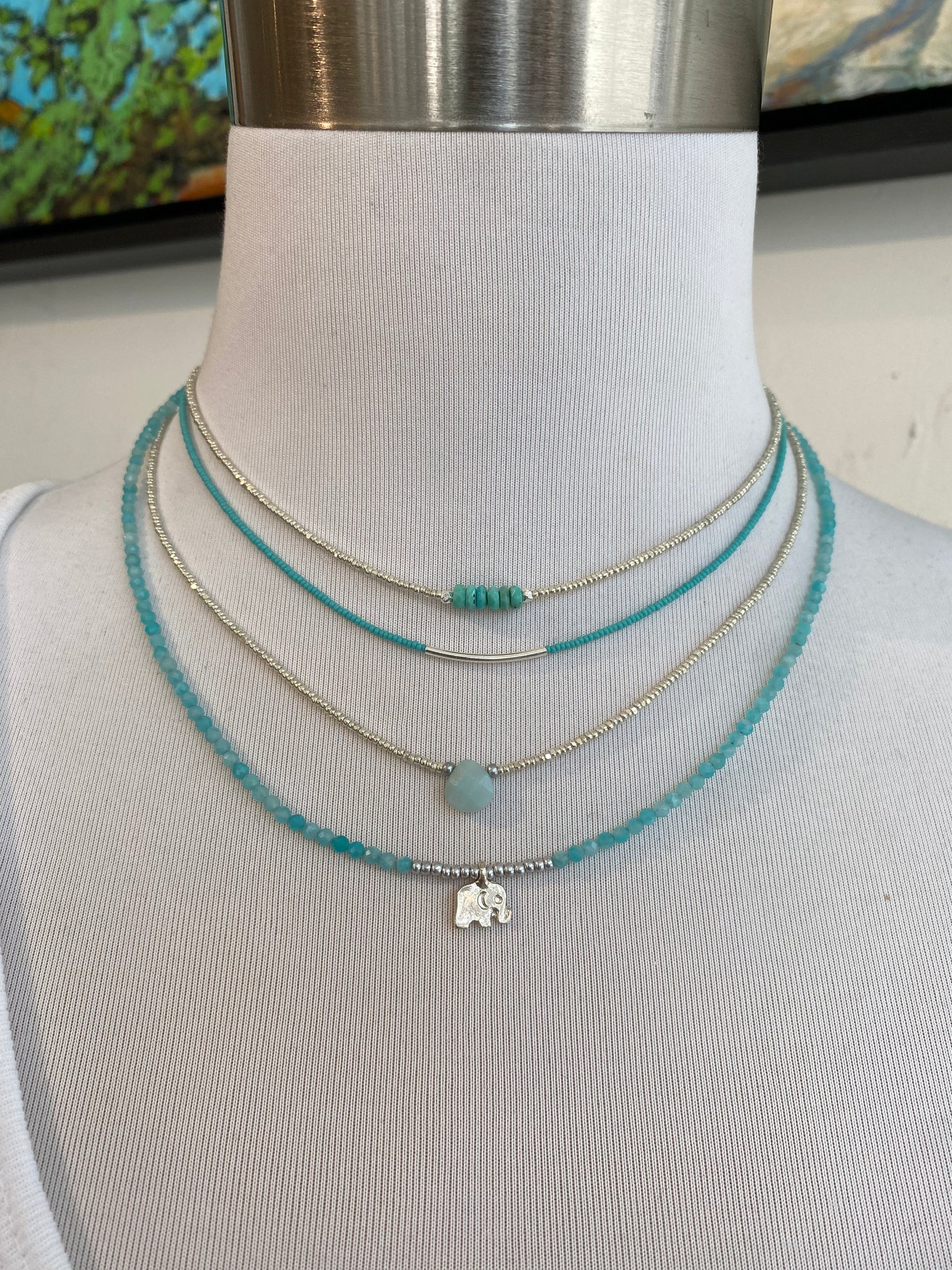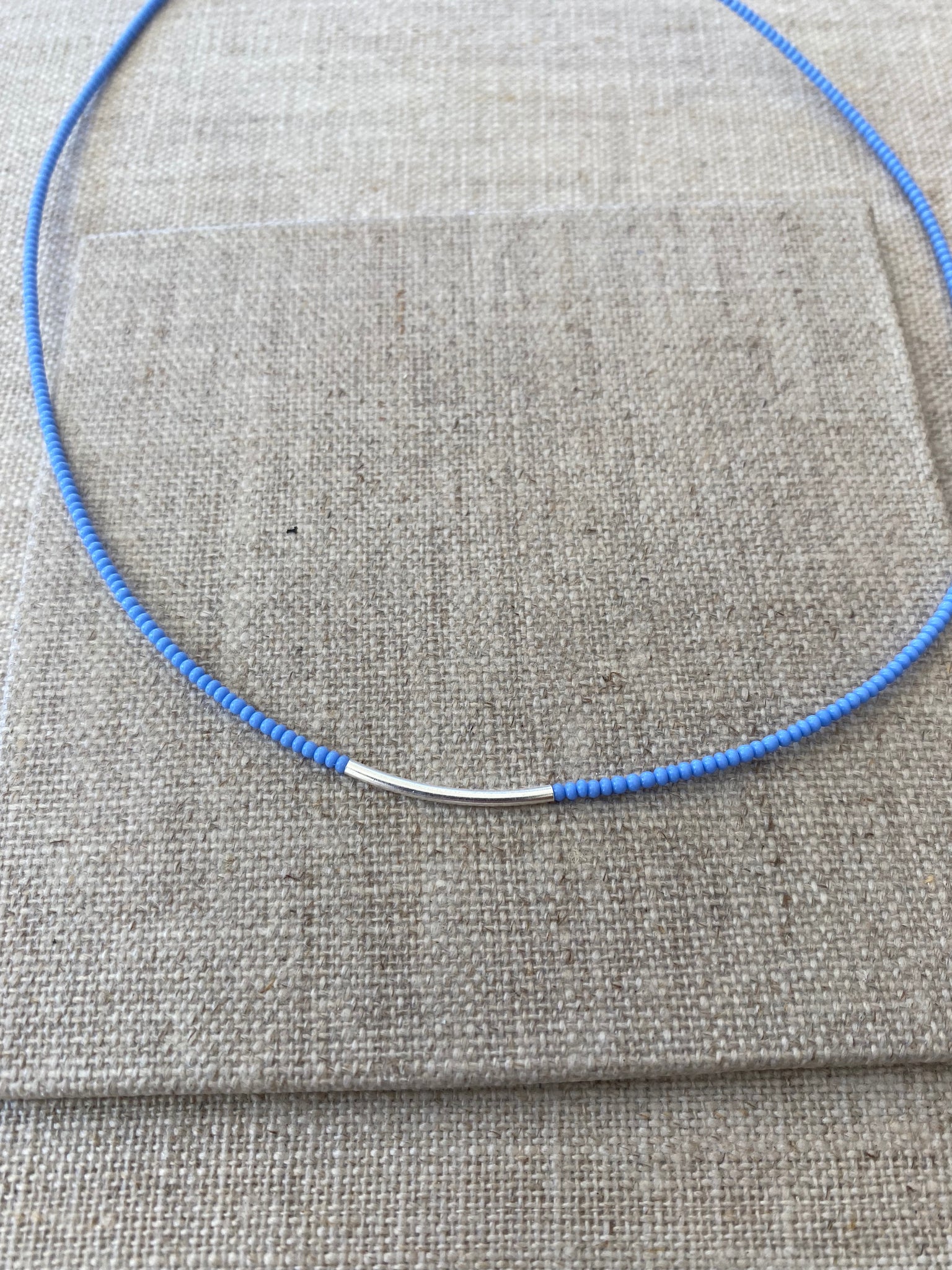 A delicate necklace of tiny glass seed beads with a sterling silver curved bar centre.