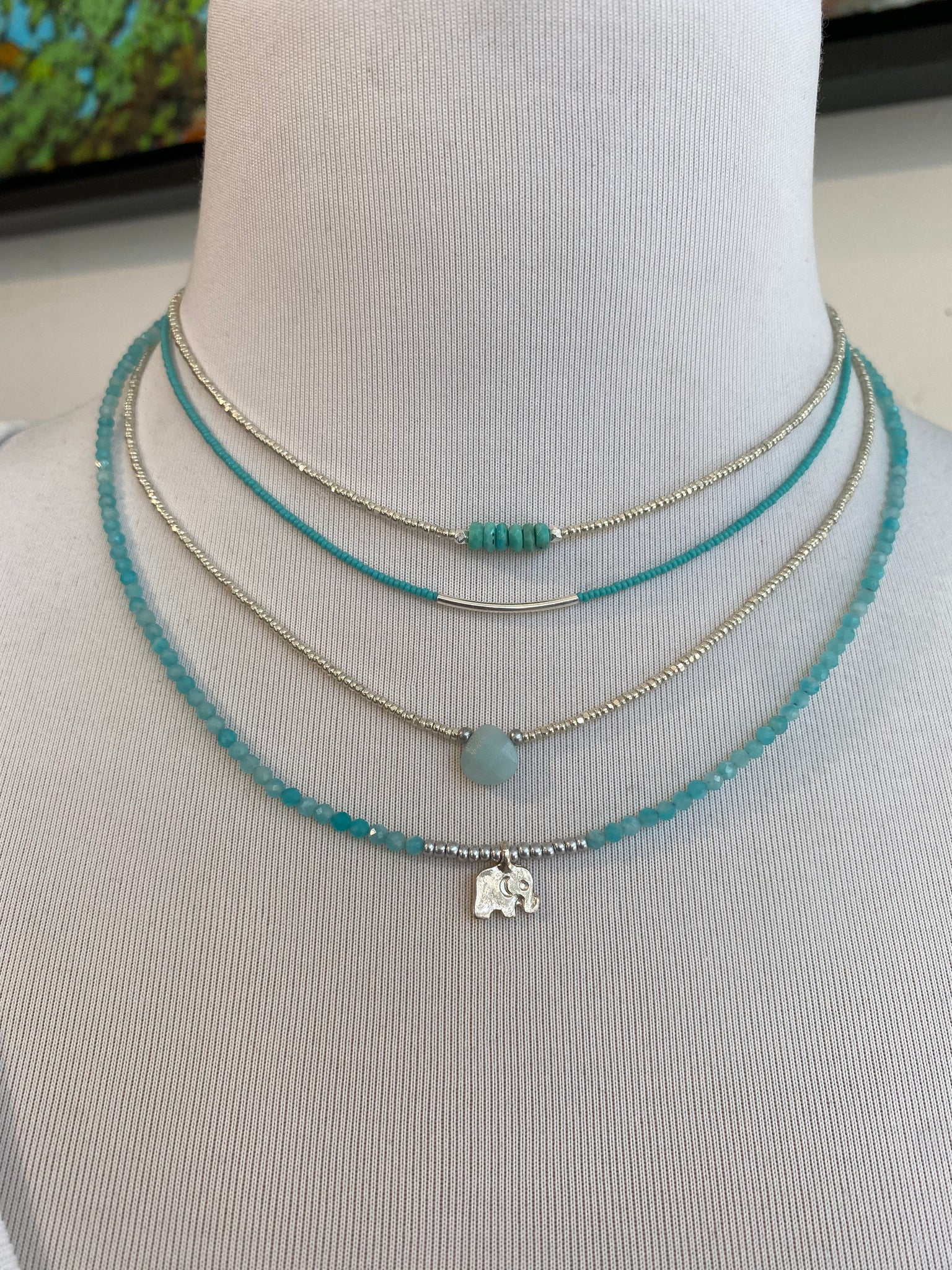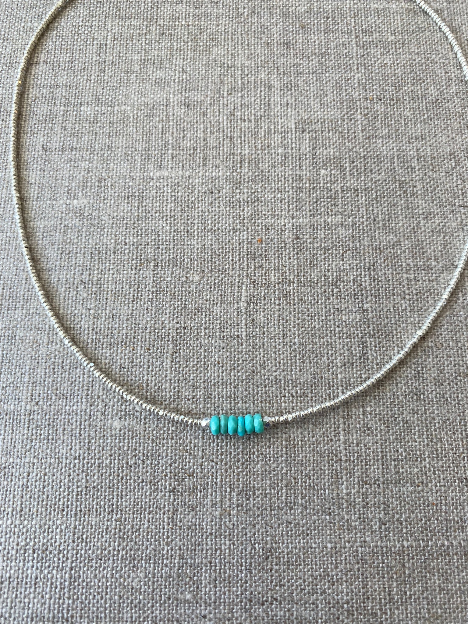A delicate necklace of tiny glass seed beads with a row of faceted Arizona Turquoise in the centre. Ends in sterling silver